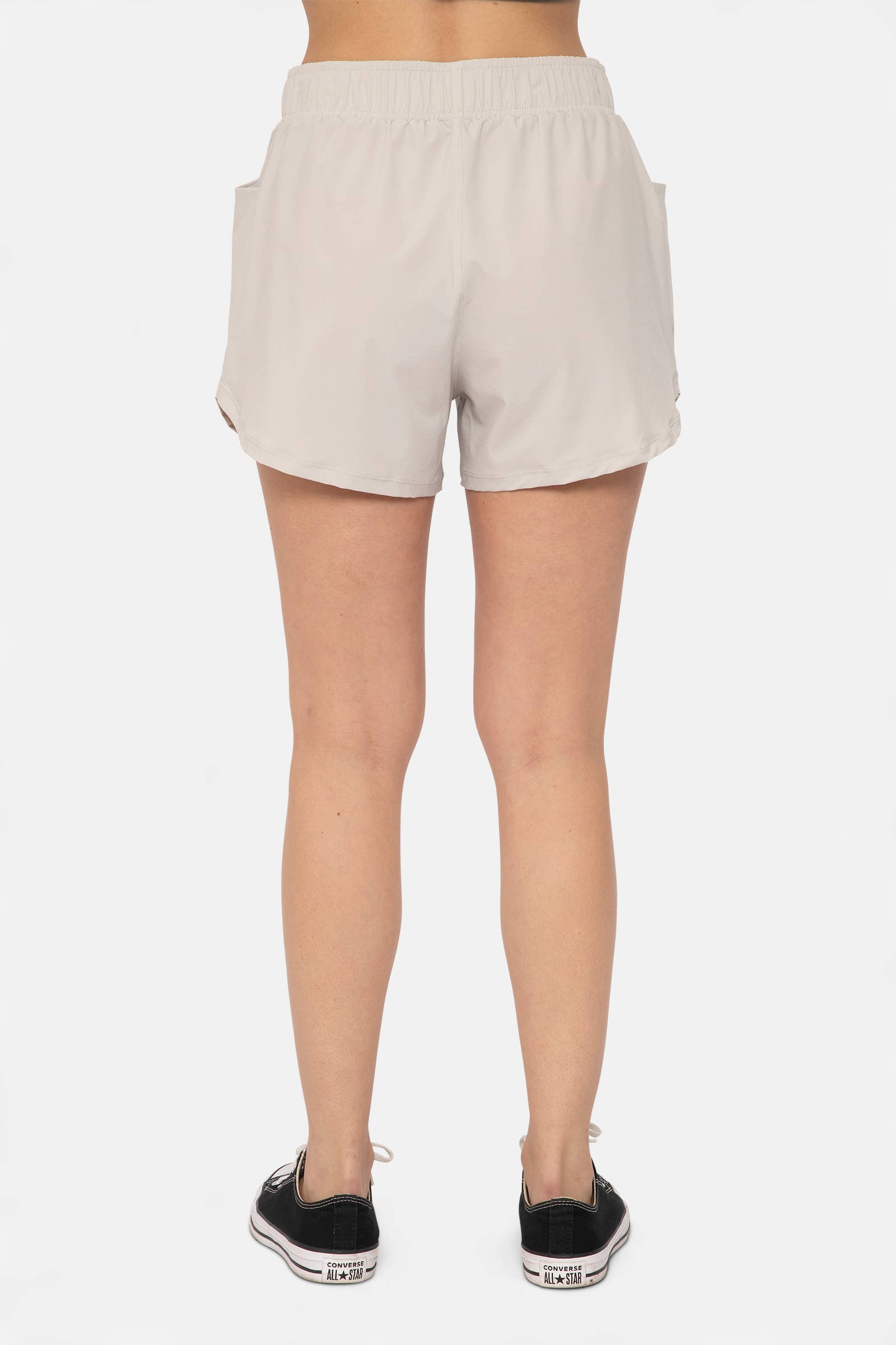 Athleisure shorts that can be worn on your next run or walking around town. They feature an elasticized waistband, pockets, and a curved hemline.