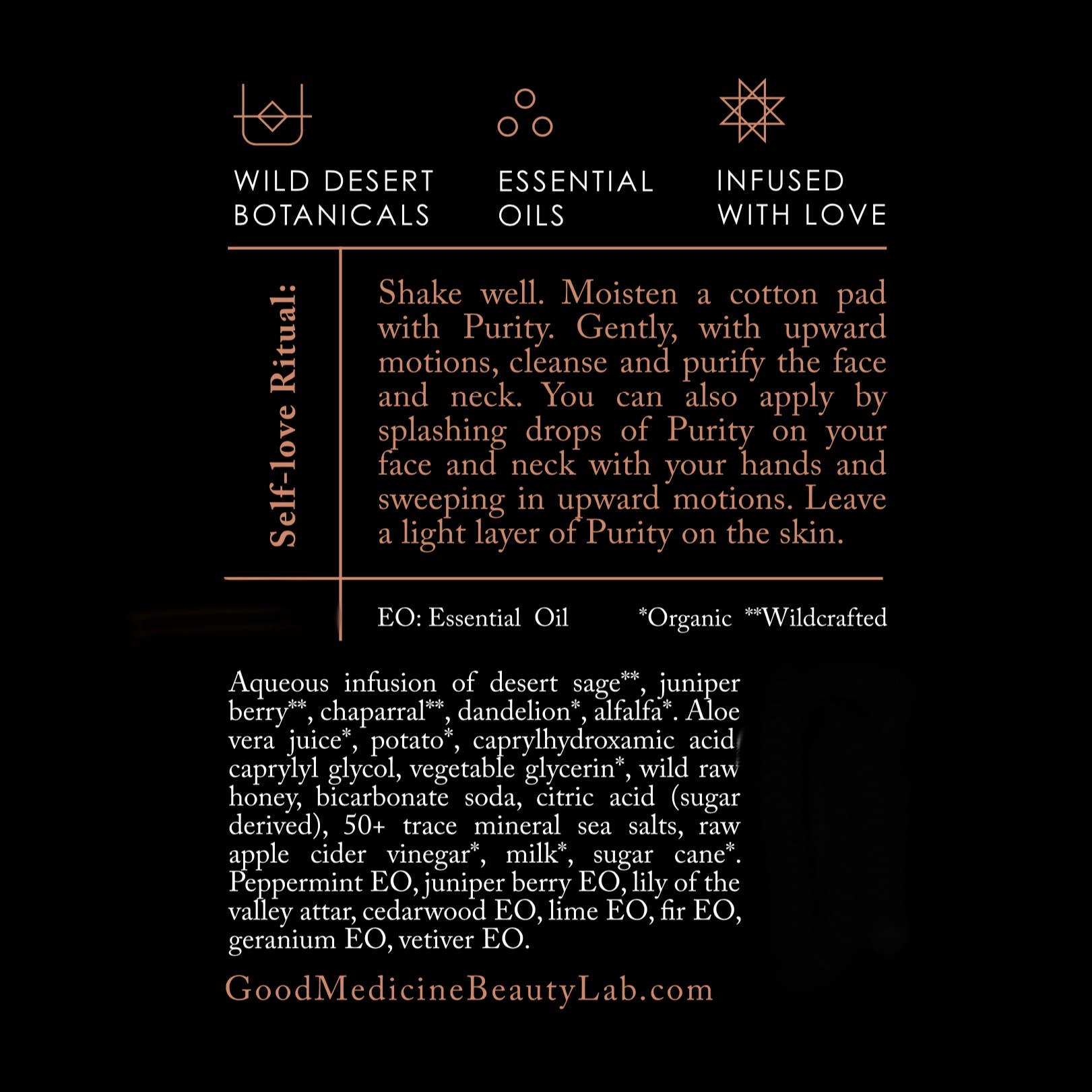 A tonic as clean and pure as the wild desert plants we harvested to create it. Purity is formulated, with superhero ingredients including dandelion and peppermint, to quickly reduce inflammation and combat bacteria. A perfect combination of powerful botanicals gently and effectively rebalance excess oil and sebum production, reducing acne flareups. An abundance of ionized minerals, alkaline solutions and anti-fungal properties form a protective shield, promoting new cell production.